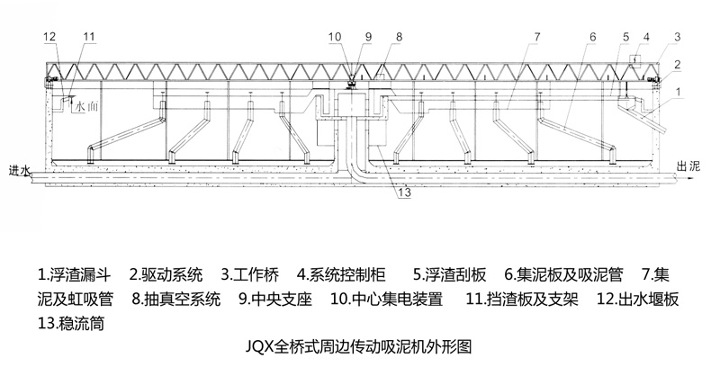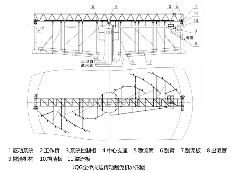 全桥式周边传动吸泥机适用于污水处理厂幅流式二次沉淀池。其主要功能是将沉降在池底的污泥刮集至一组半径方向布置的吸泥管管口,再通过中心排泥管排出,以便污泥回流或浓缩脱水。视情况需要,还可以设置池面刮渣机构,收集池面浮渣并通过浮渣漏斗排出池外。