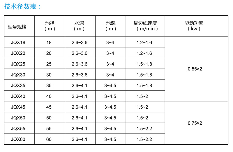 7.设备可以按用户特定尺寸制造。可提供平底池、斜底池和不需要集泥板的大扁嘴吸口的刮泥机。与水接触的部件可以用不锈钢制作。