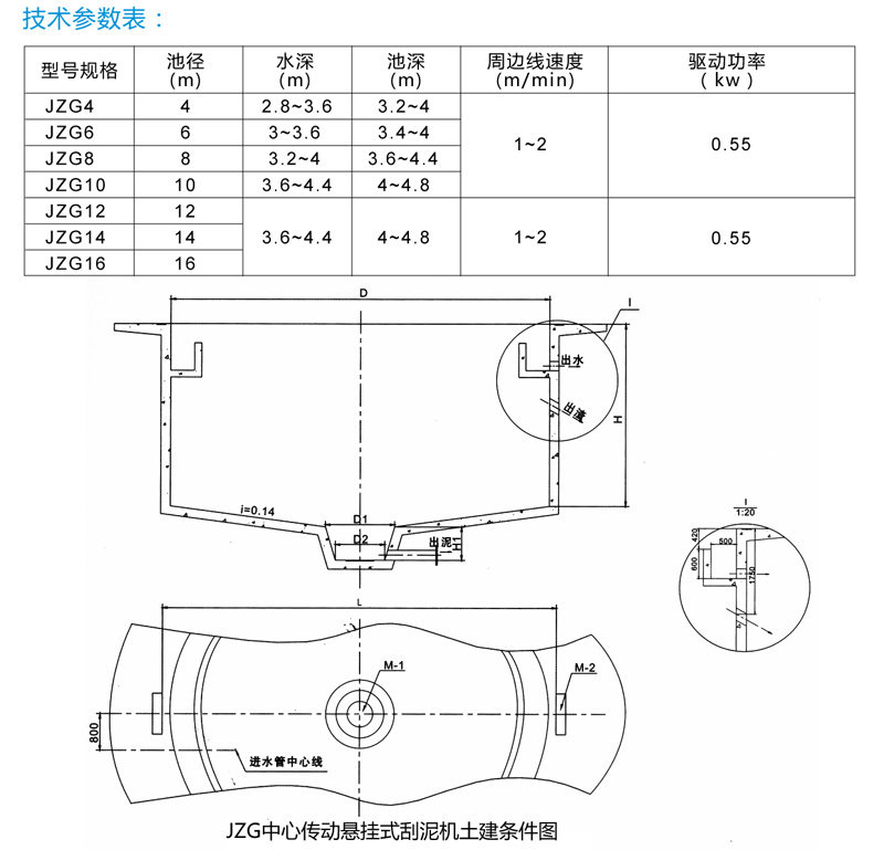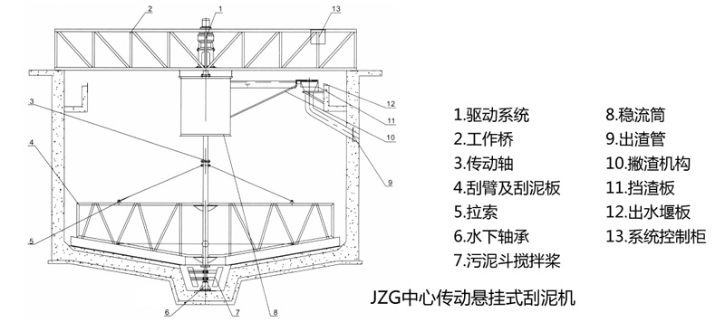中心传动刮泥机适用于污水处理厂幅流式沉淀池。其主要功能是将沉降在池底的污泥刮集至积泥坑,以便污泥回流或浓缩脱水。视情况需要,还可以设置池面刮渣机构,收集池面浮渣并通过浮渣漏斗排出池外。