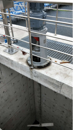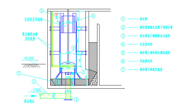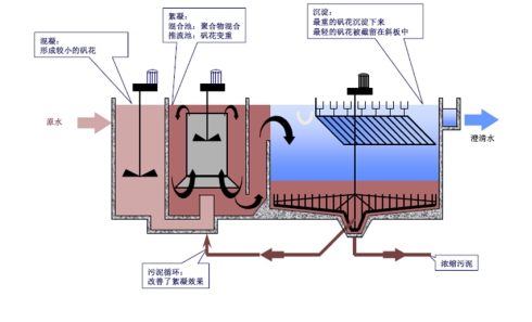 絮凝剂促使进入的小絮体通过吸附、电性中和和相互间的架桥作用形成更大的絮体,慢速搅拌器的作用既使药剂和絮体能够充分混合又不会破坏已形成的大絮体、通过导流筒是水流上方、再通过导流筒内的加药环管使药剂混合估价充分。
