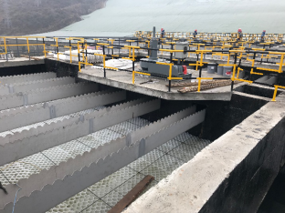 絮凝后出水进入沉淀池的斜板底部然后上向流至上部集水区,颗粒和絮体沉淀在斜板或斜管的表面上并在重力作用下下滑。较高的上升流速和斜板60°倾斜可以形成一个连续自刮的过程,使絮体不会积累在斜板上。