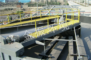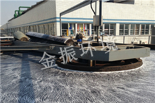 JQF型高效浅层气浮装置集凝聚、气浮、撇渣、沉淀、刮泥为一体,整体呈圆柱形,结构紧凑,池子较浅。装置主体由五大部分组成:池体、旋转布水机构、溶气释放机构、框架机构、集水机构等。进水口、出水口与浮渣排出口全部集中在池体中央区域内,布水机构、集水机构、溶气释放机构都与框架紧密连接在一起,围绕池体中心转动。
