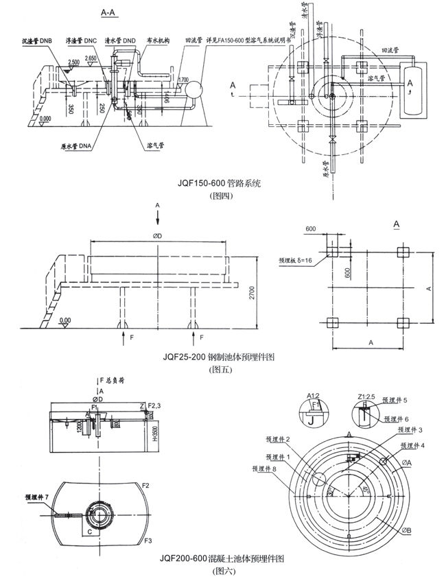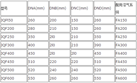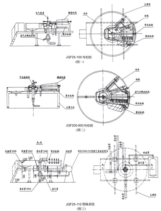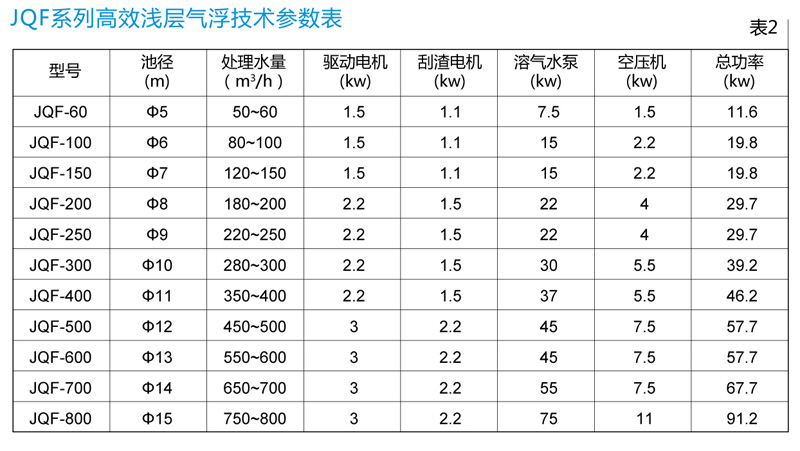 注:1、表中处理水量依据,回流比R=30%,水力表面负荷:q=6-8m3/m2.h。3、JQF25-JQF200,为钢制池体,其工作荷载指整机正常工作时,土建地基承受的总负荷。